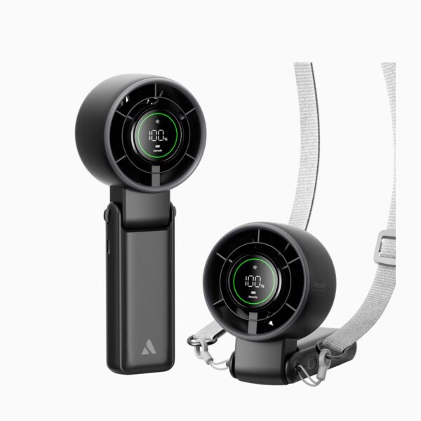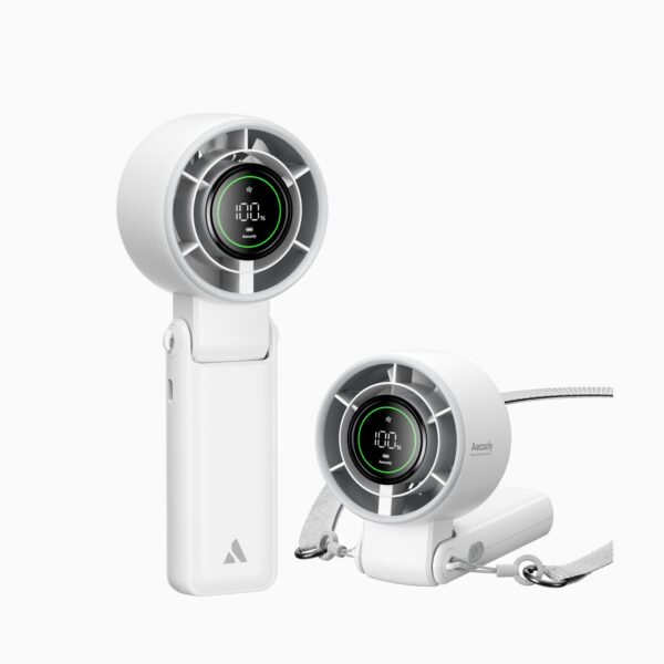 - Stay cool in style with the Aecooly Portable Halo Fan, a 3-in-1 solution designed for handheld, desktop, or hands-free use with the included neck strap. Its dual-ring turbo airflow system delivers powerful, consistent cooling, while 5 adjustable speeds let you fine-tune your comfort. With up to 22 hours of battery life, it’s perfect for travel, outdoor adventures, or daily routines. Compact, foldable, and elegantly designed, it also makes a thoughtful gift that blends functionality with modern convenience.