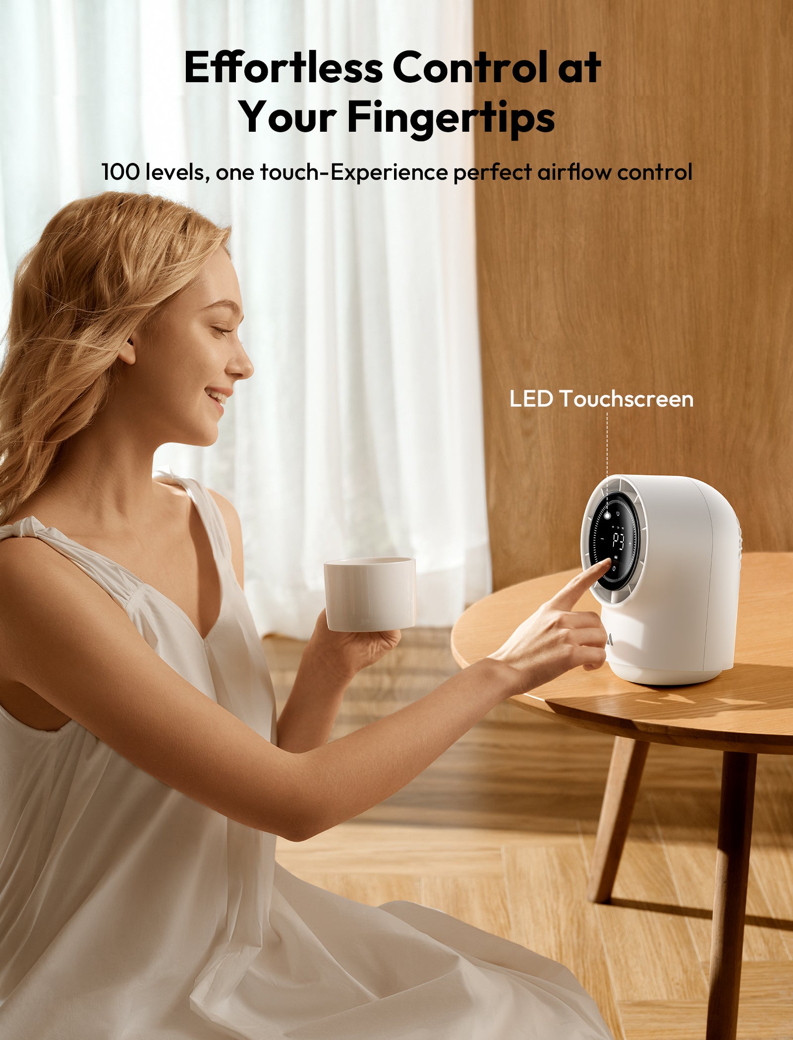 - Aecooly Smart Touch Desk Fan features an intuitive LED touch screen for easy control and precise airflow adjustment with 100 speed levels. Engineered for ultra-quiet operation at low speeds, it ensures a peaceful environment. Powered by a long-lasting 8000mAh battery, it’s perfect for home, office, travel, and outdoor use. With flexible oscillation angles (60°, 120°, 180°) and adjustable tilt, it delivers customized cooling. Its gentle forest breeze mode provides a smooth, natural airflow for ultimate comfort and relaxation.