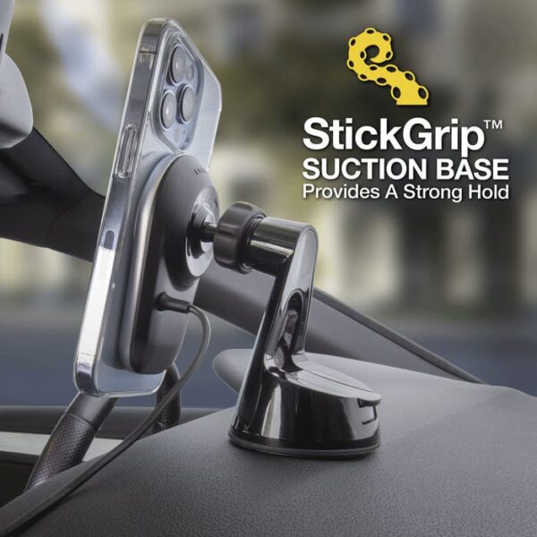 • The StickGrip™ pad and suction-cup base securely hold the mount to a vehicle’s window/dash