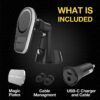 Included: (1) MagicMount Pro Charge5 Wireless Suction Mount, (1) MagicPlate, (1) 12V 20W USB-C Car Adapter for 2nd device, (2) Cable Management Clips (1) Prep Wipe and (1) User Manual