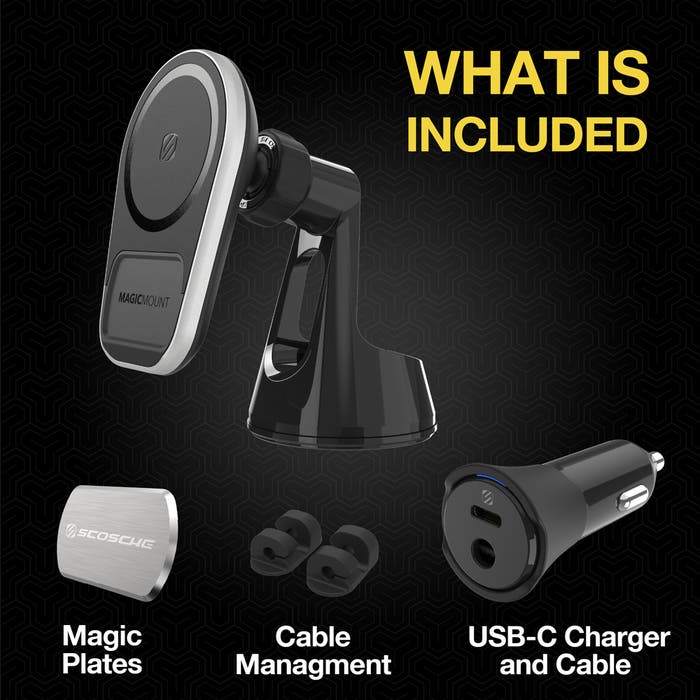 Included: (1) MagicMount Pro Charge5 Wireless Suction Mount, (1) MagicPlate, (1) 12V 20W USB-C Car Adapter for 2nd device, (2) Cable Management Clips (1) Prep Wipe and (1) User Manual