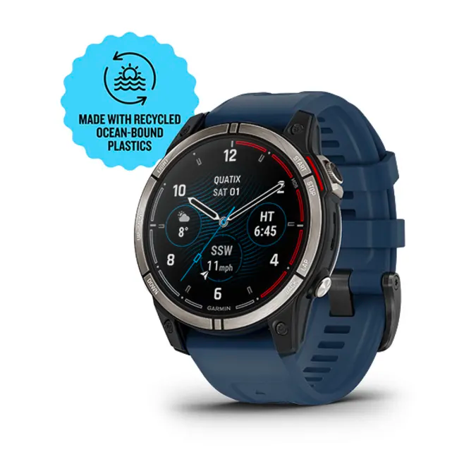 This rugged marine watch features a large 1.3″ AMOLED display with scratch-resistant sapphire lens. 100% of the plastic used in its eco-friendly housing design comes from recycled ocean-bound plastics.