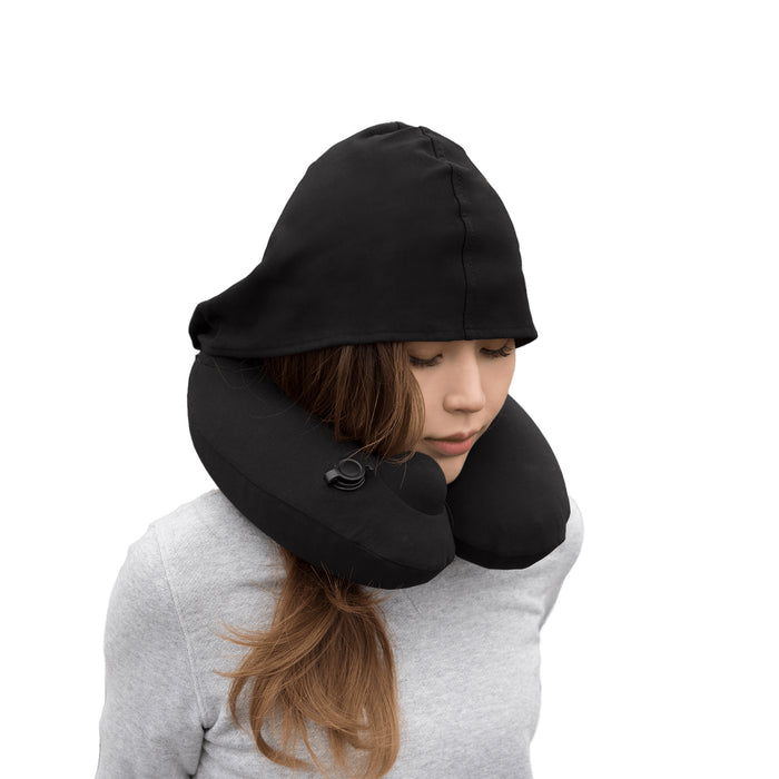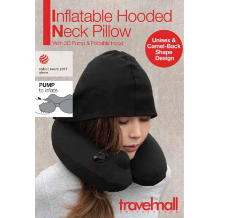 Travelmall World’s First 3D Inflatable Neck Pillow with Patented Pump and Foldable Hood, Black Color